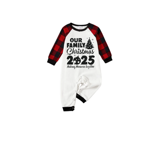 Our Family Christmas 2025 Family Pajamas Set - White Top, Red Plaid Pants, Black Sleeves, Christmas Tree and Ornaments Print