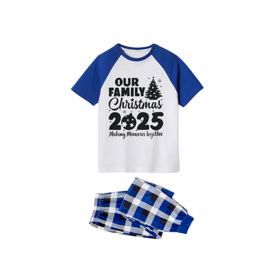Our Family Christmas 2025 Family Pajamas Set - White Top, Blue Plaid Pants, Blue Sleeves, Christmas Tree and Ornaments Print