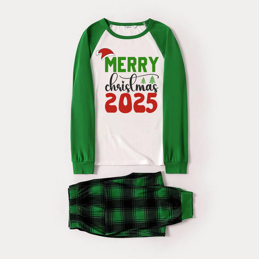 Merry Christmas 2025 Print Long Sleeve Top With Green & Black Plaid Christmas Matching Pajamas
