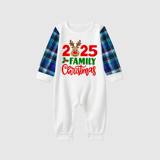 2025 Reindeer Family Christmas Family Pajamas Set - White Top / Blue Green Plaid Pants / Blue Sleeves