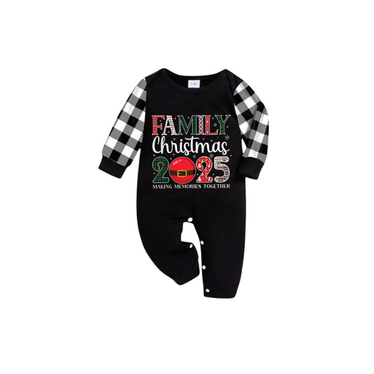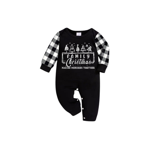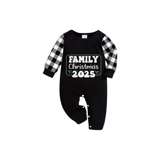Black and White Plaid Short Sleeve Christmas Pajamas Set With We are Family Festive Lettering Print