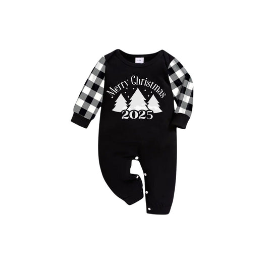 Black and White Plaid Short Sleeve Christmas Pajamas Set with Tree and Holiday Text Design