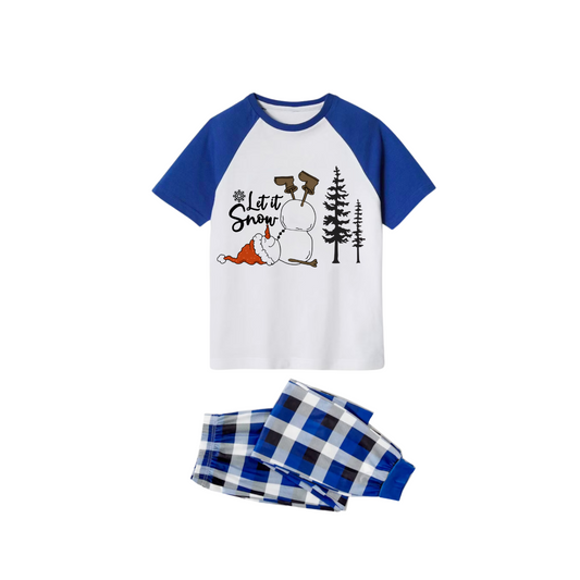 Let It Snow Family Pajamas Set - White Top Blue Sleeves Blue Plaid Pants Christmas Snowman Graphic