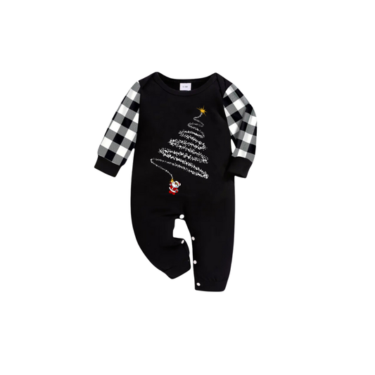 Santa Climbing Christmas Tree Family Pajamas Set - Black Top Black and White Plaid Pants White Tree Graphic