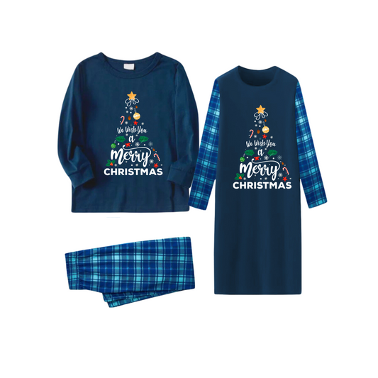 Merry Christmas Letter & Tree Printed Pattern Blue Long Sleeve Top and Blue & White Plaid Pants Family Matching Pajamas
