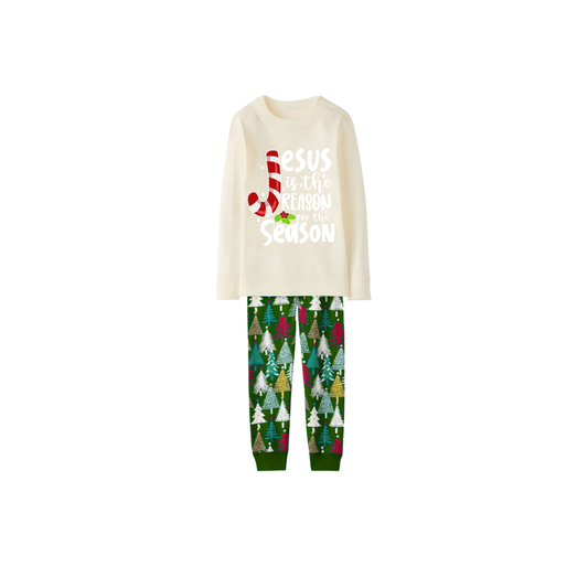 Matching Family Christmas Pajamas Jesus Is the Reason, Cream & Tree Pattern