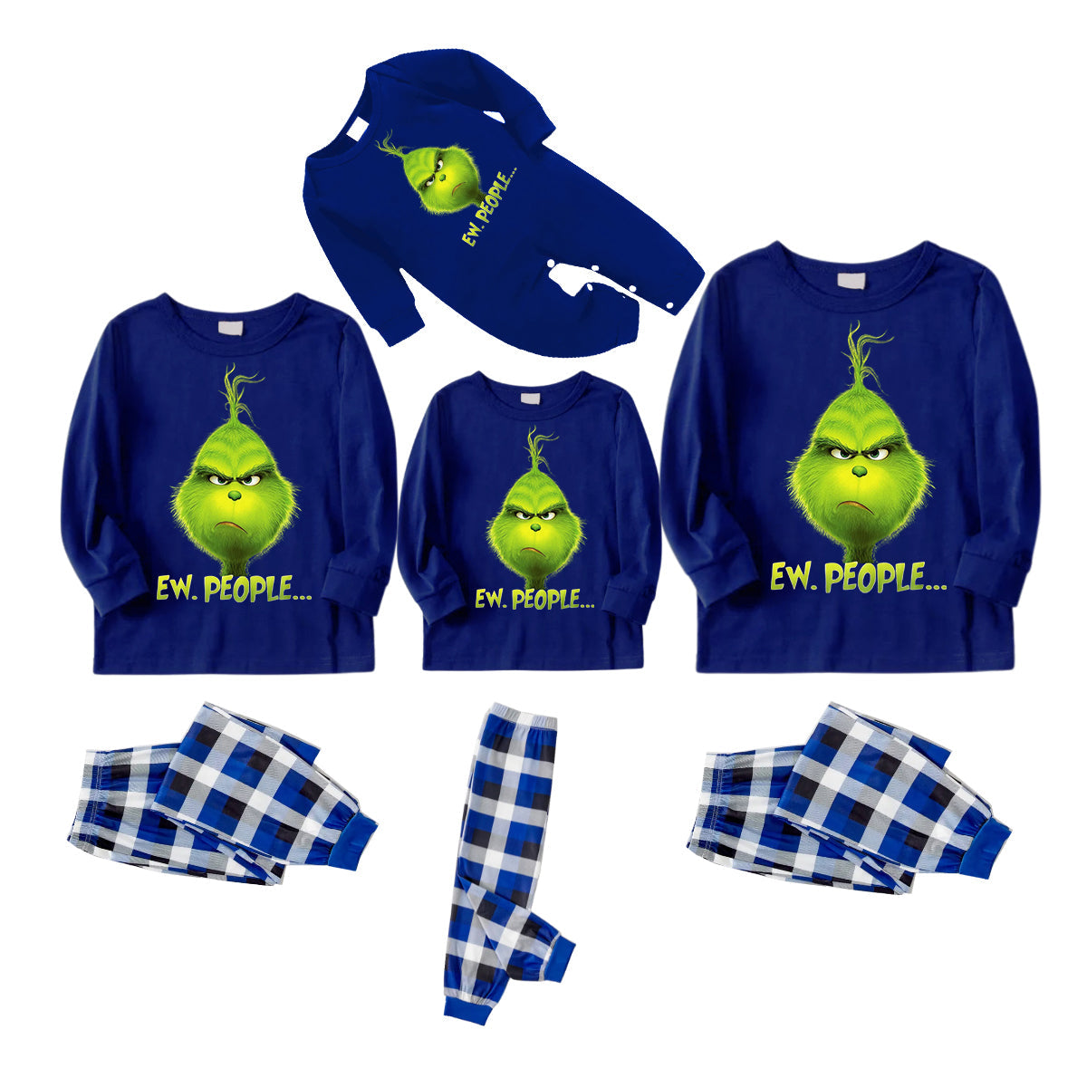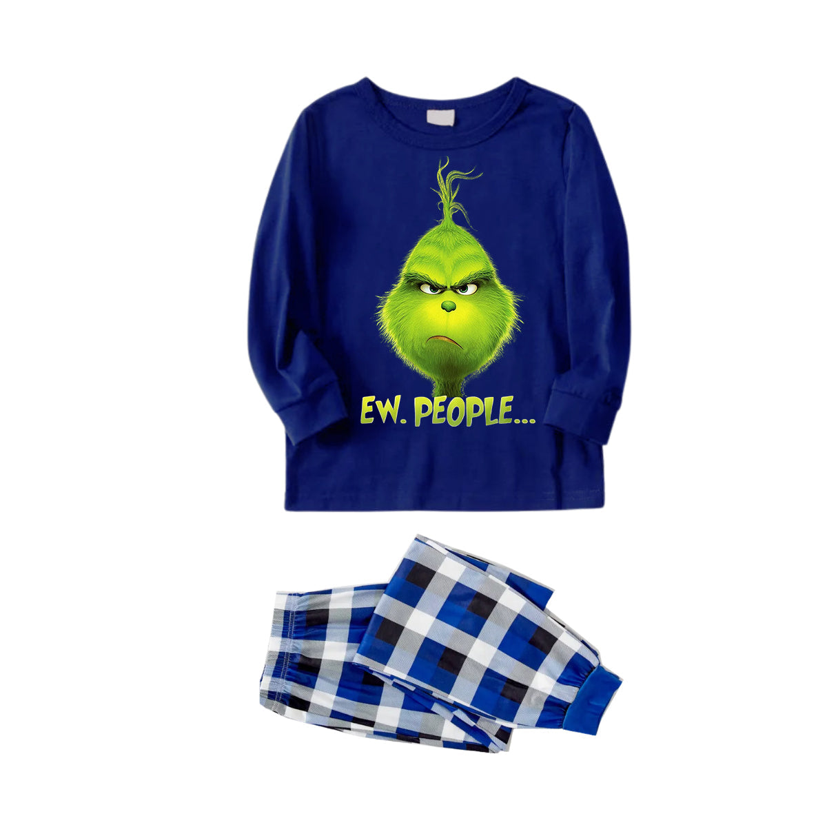 Christmas Cartoon Pattern and EW People Print Blue Long Sleeves with Blue&White&Black Plaid Pants Family Matching Pajamas
