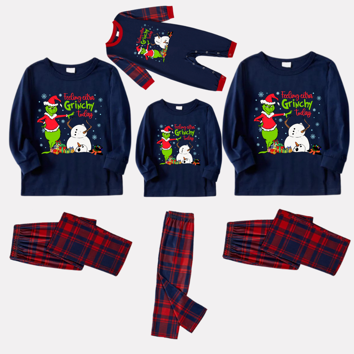 Navy & Red Plaid Christmas Pajamas Set With Grinch and Snowman Print
