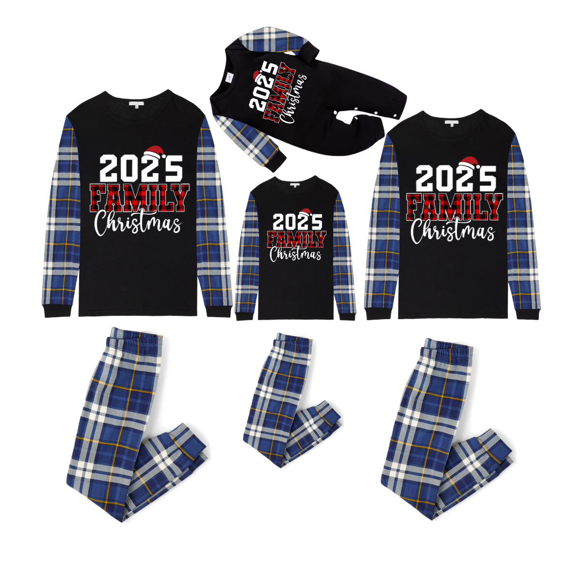 2025 Family Christmas Family Pajamas Set - Black Top, Blue Pants, Blue Buffalo Plaid Sleeves, Letter Print