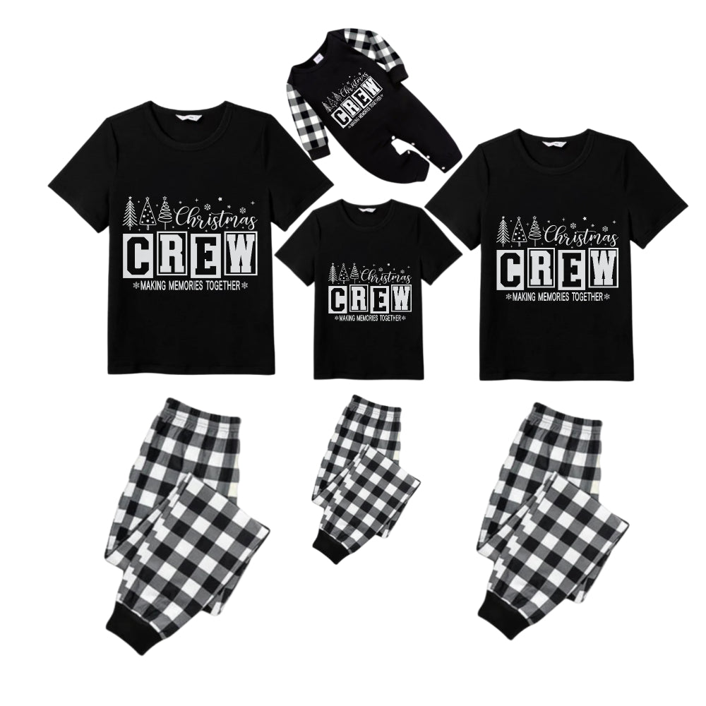 Black and White Plaid Short Sleeve Christmas Family Pajamas Set With "Christmas Crew Making Memories Together" Print