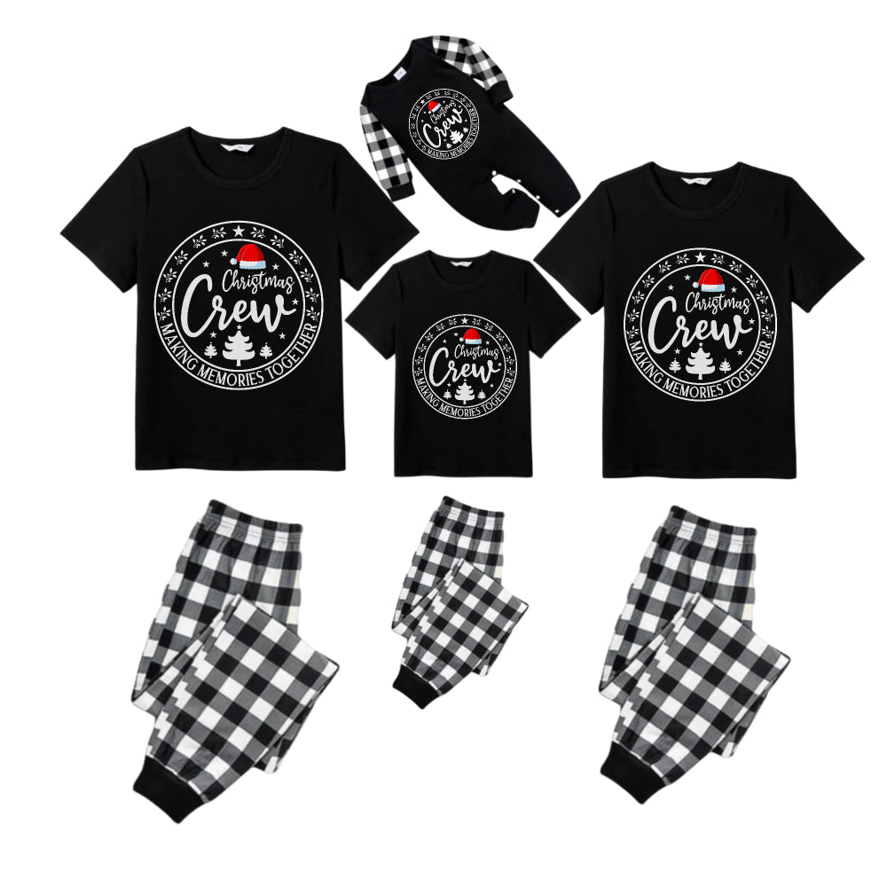Black and White Plaid Short Sleeve Christmas Family Pajamas Set With Santa Hat and "Christmas Crew Making Memories Together" Print