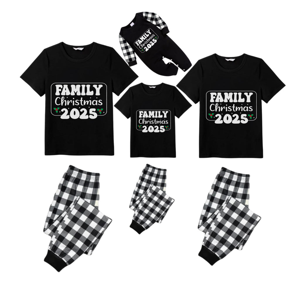 Black and White Plaid Short Sleeve Christmas Pajamas Set With Holiday Slogan Print