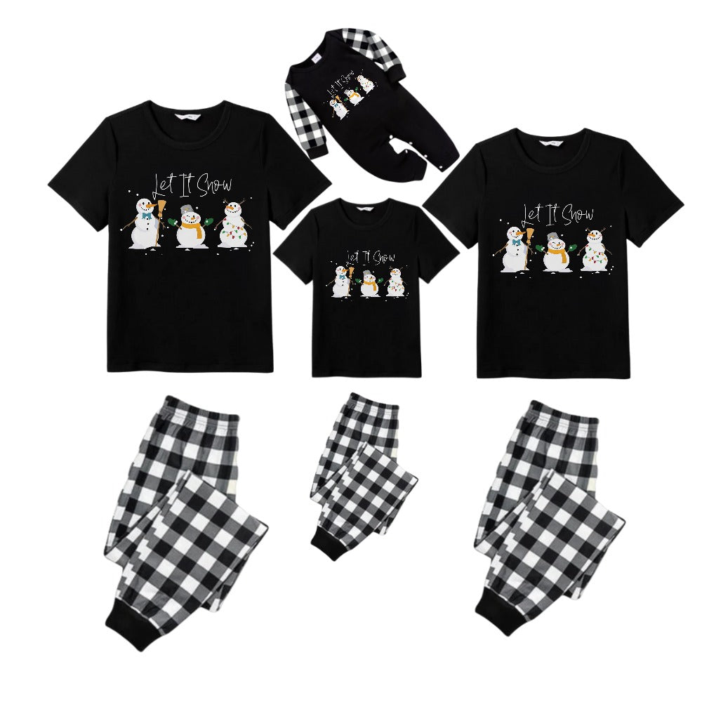Black and White Plaid Short Sleeve Christmas Pajamas Set With Snowman and Cheer Text Prints