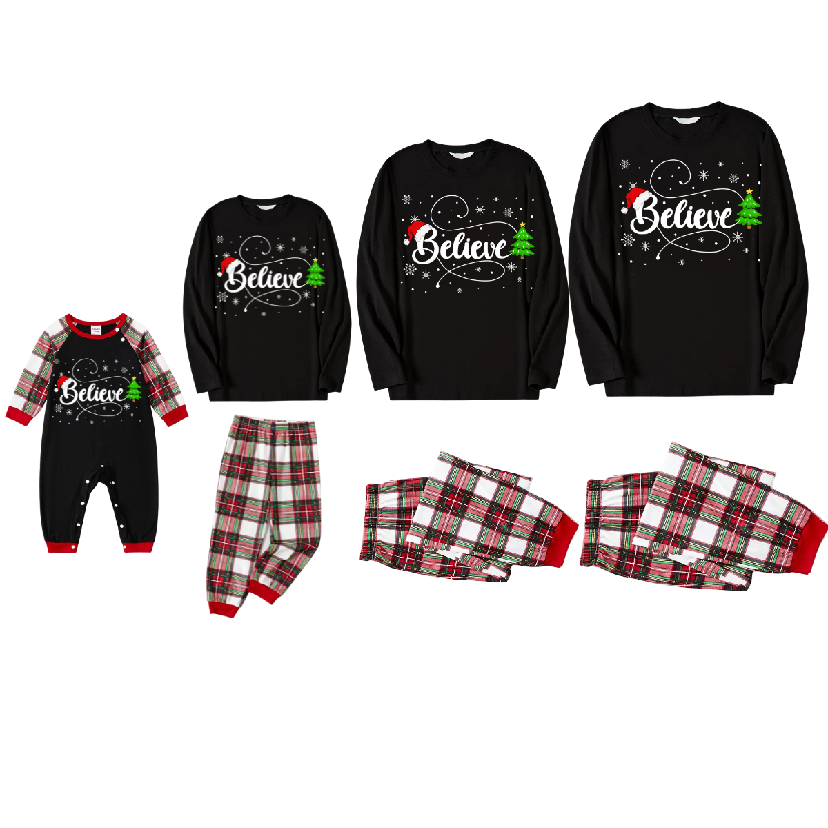 Christmas "Believe" Text and Tree Print Black Long Sleeve Top with Red & White & Green Plaid Family Matching Pajamas