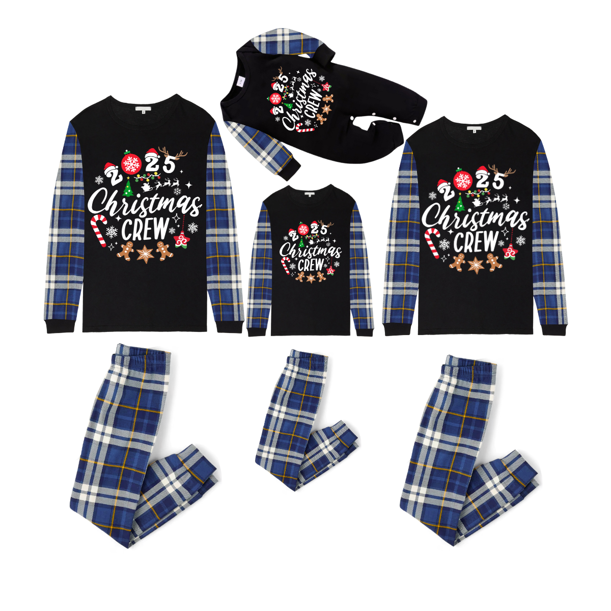 Christmas Crew 2025 Family Pajamas Set - Black Top, Blue Pants, Blue Plaid Sleeves, Gingerbread Candy Print