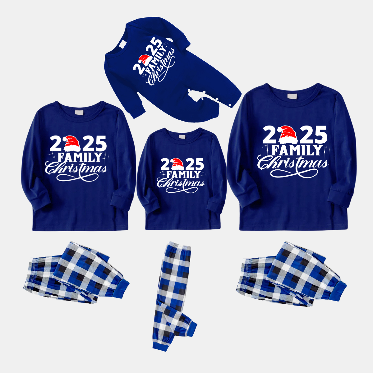 "2025 Family Christmas" Text Print Blue Long Sleeves with Blue&White&Black Plaid Pants Family Matching Pajamas