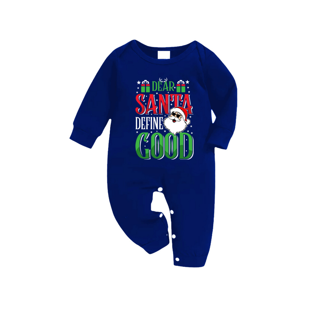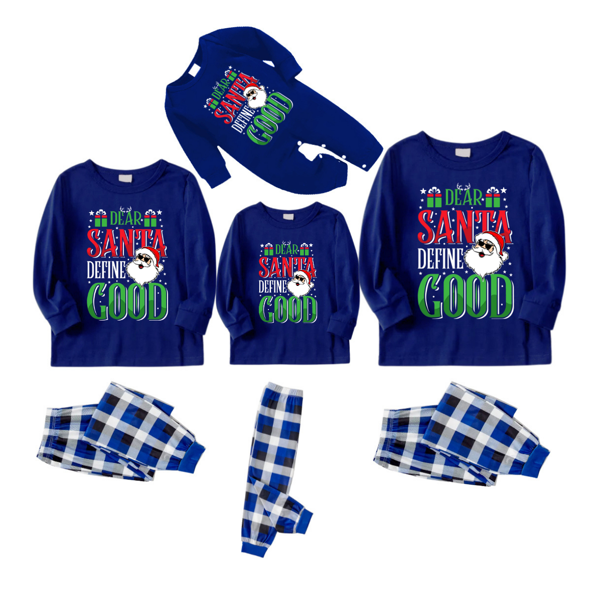 "Dear Santa Define Good" Text Printed Blue and White Plaid Family Matching Pajamas