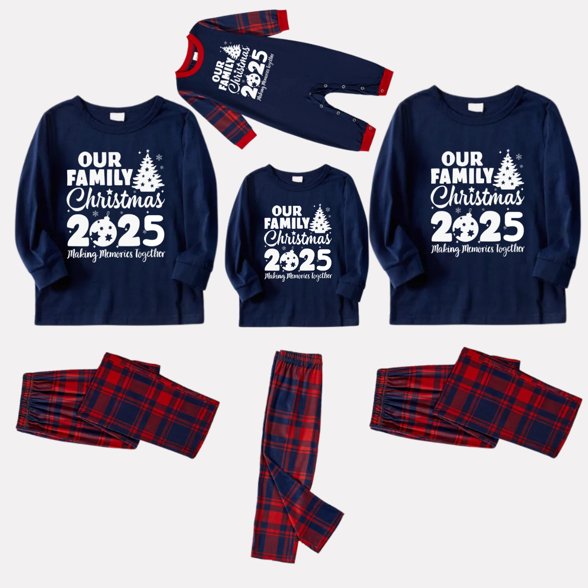 'Our Family Chirstmas 2025 Making Memories Together' Letter Print Blue Long Sleeves Top with Red and Blue Plaid Pants Christmas Matching Pajamas