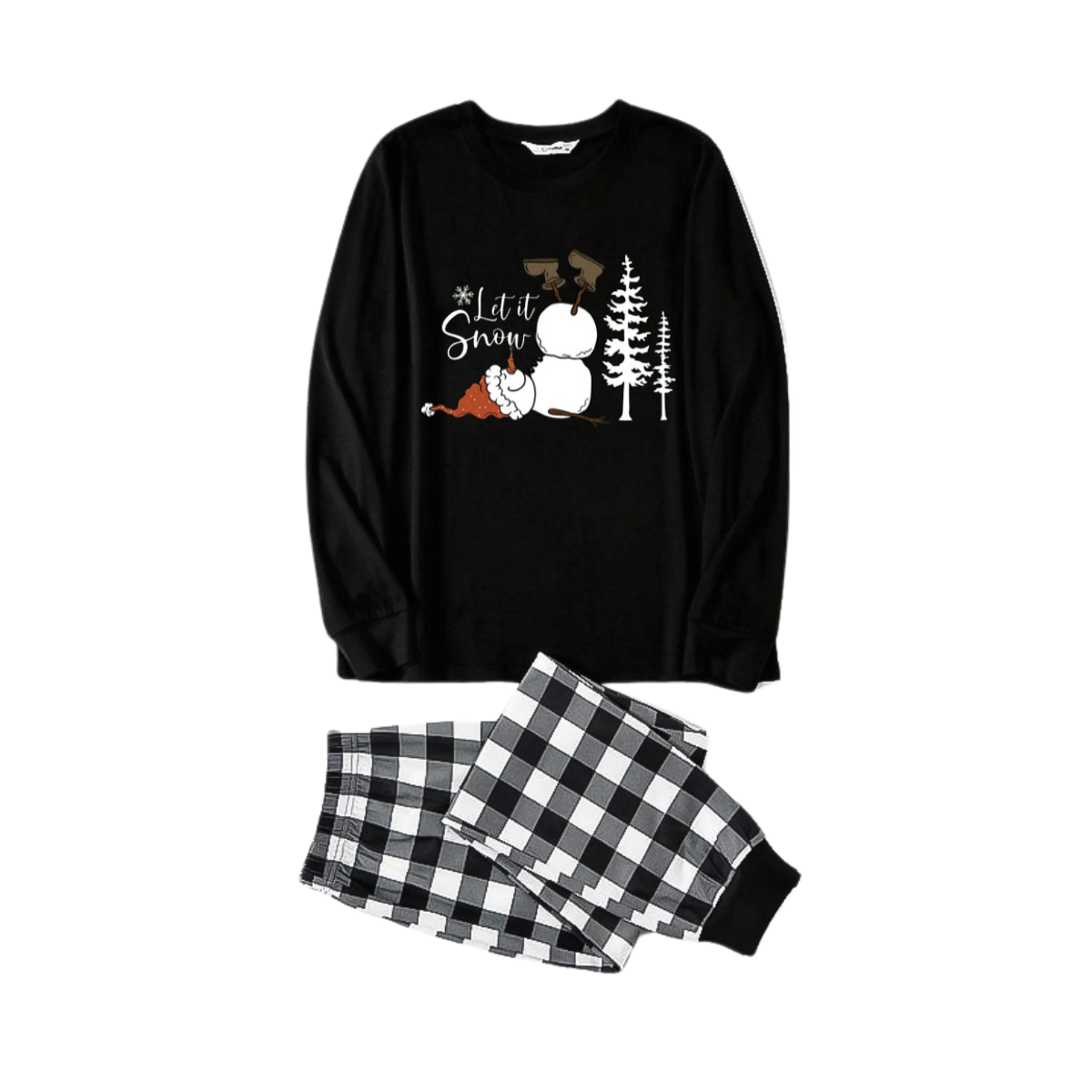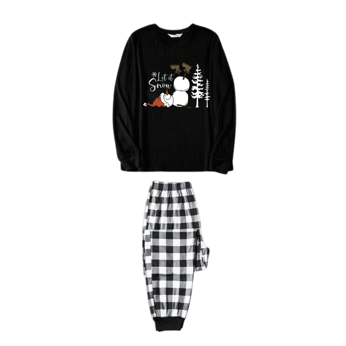 "Let it Snow" Text and Snowman Prints Black and White Plaid Family Matching Pajamas