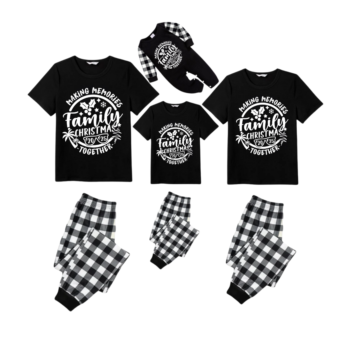 Making Memories Together Family Christmas 2025 Pajamas Set - Black Top Black and White Plaid Pants White Graphic Text