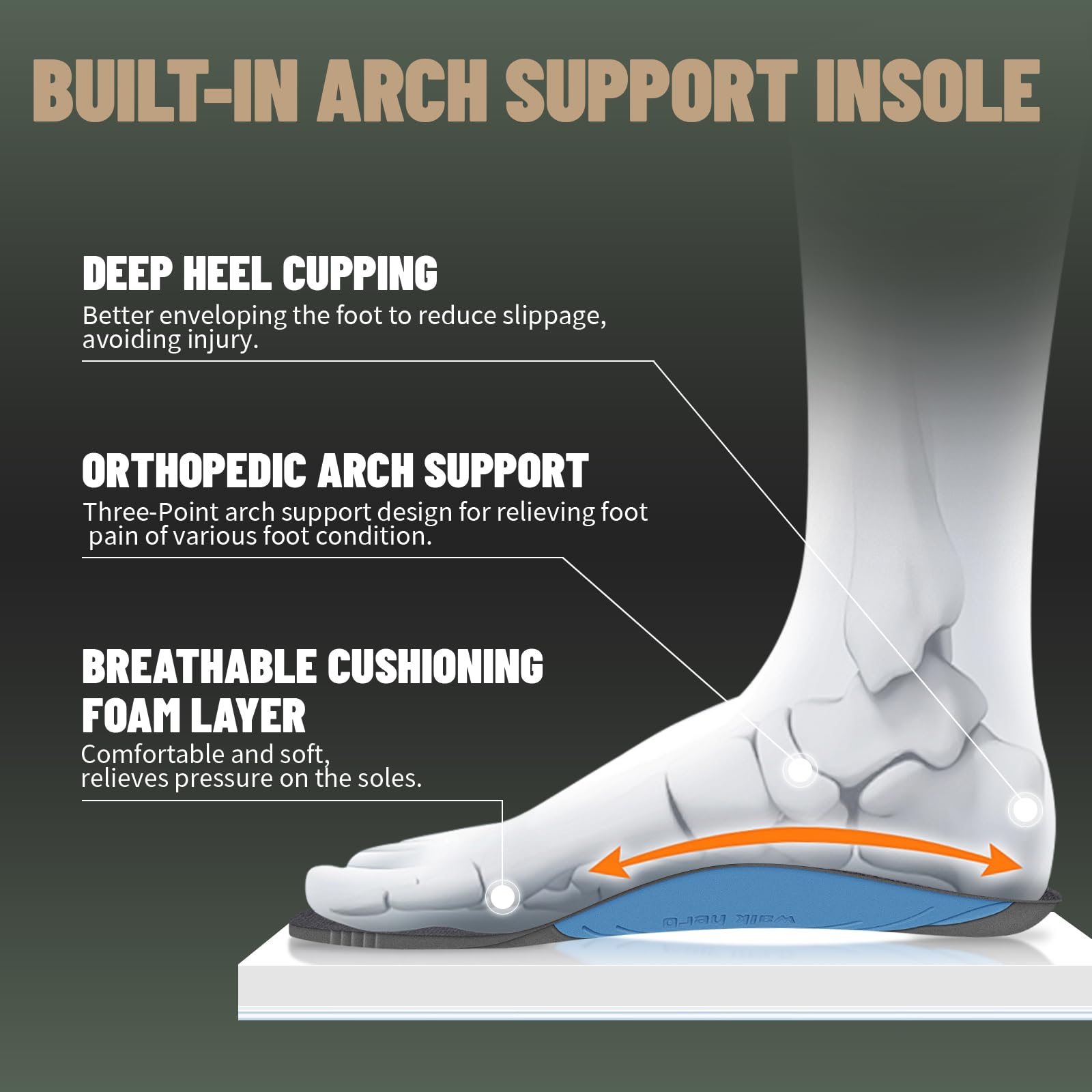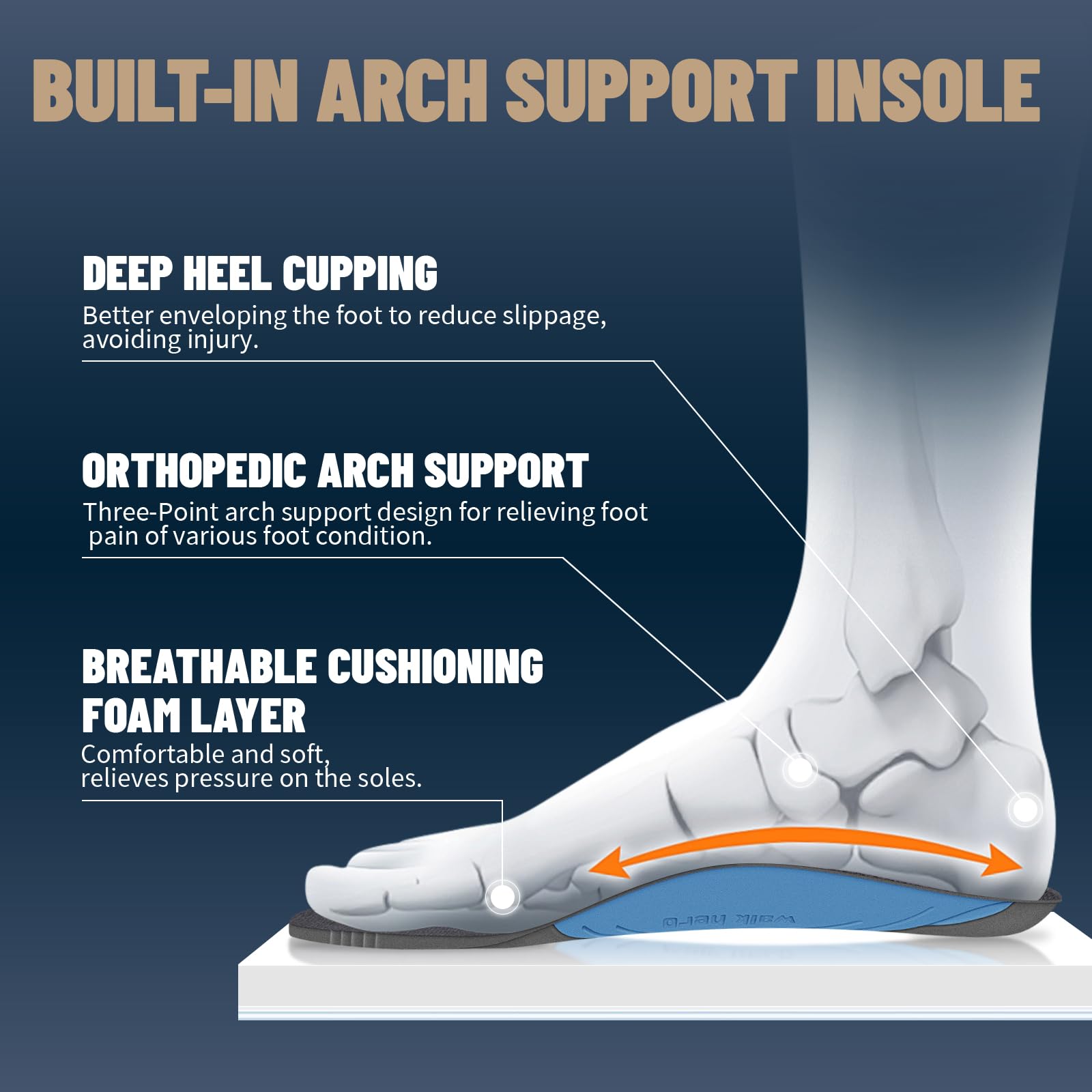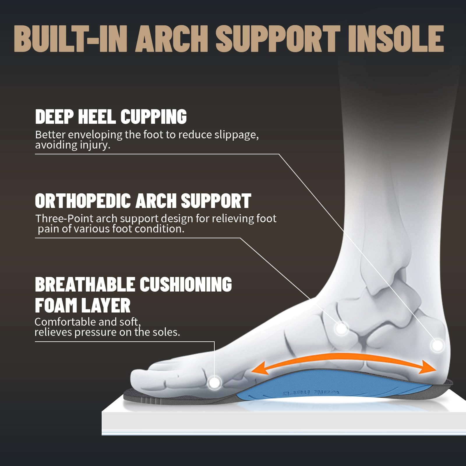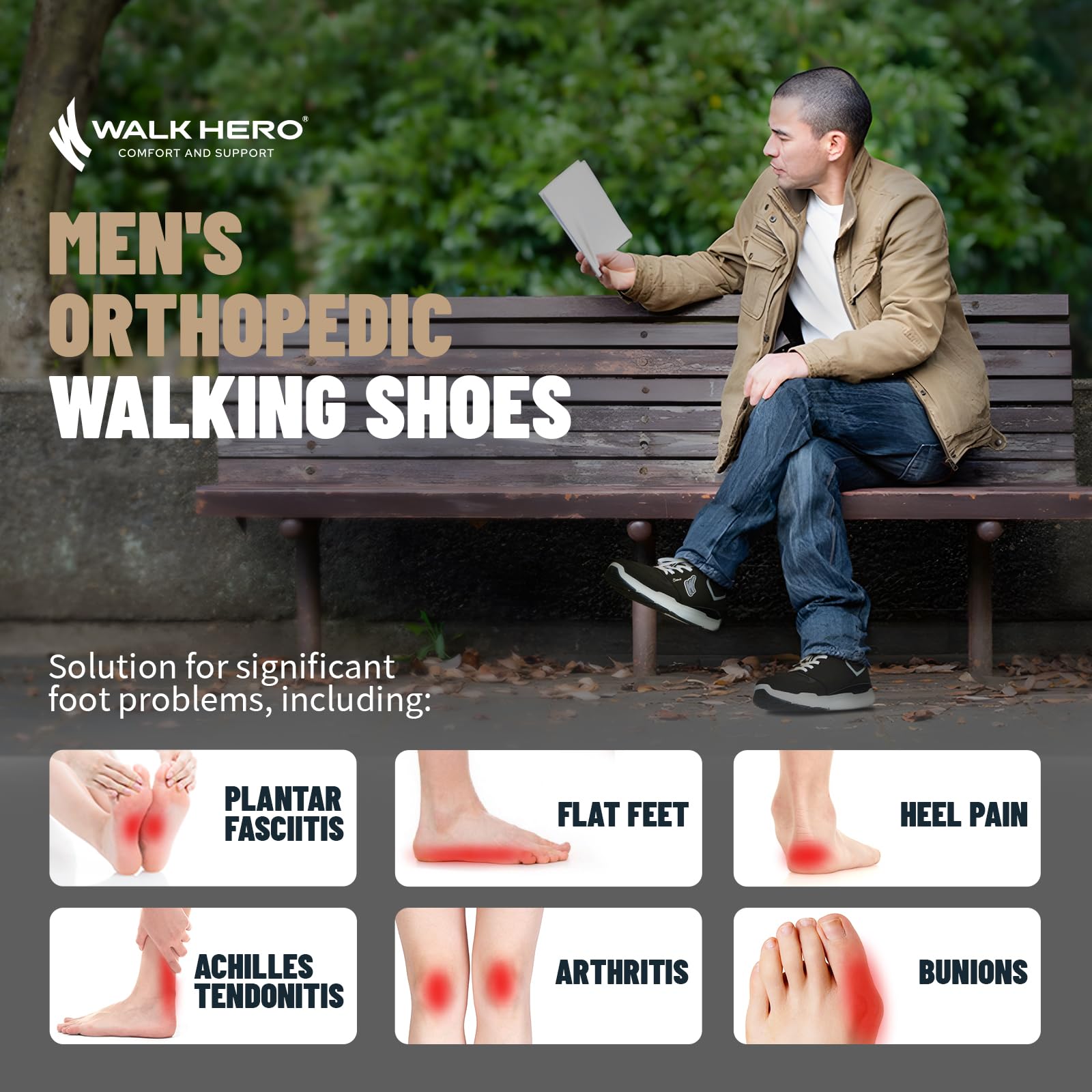 ARCH SUPPORT FUNCTION: Men's Walking Shoes along with WALK·HERO orthotic insole design for solving various foot conditions; Including. foot and heel pain. plantar fasciitis. flat feet. diabetes. arthritis. bunions. and more.