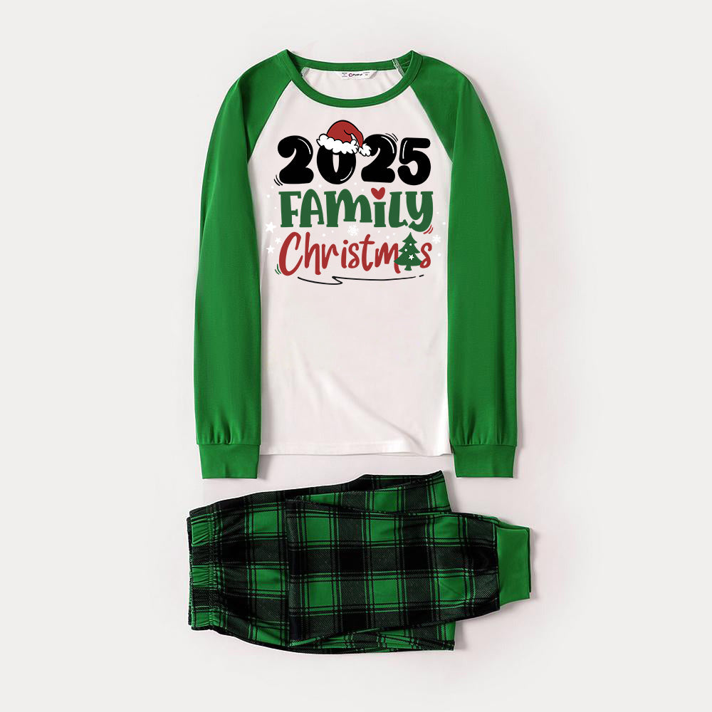 Santa Hat and Family Christmas 2024 Print Long Sleeve Top With Green & Black Plaid Christmas Matching Pajamas
