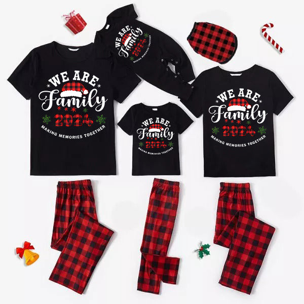 "We are Family" Santa Hat Monogram Print Letter Black Short Sleeve with Red & Black Plaid Pant Family Matching Pajamas