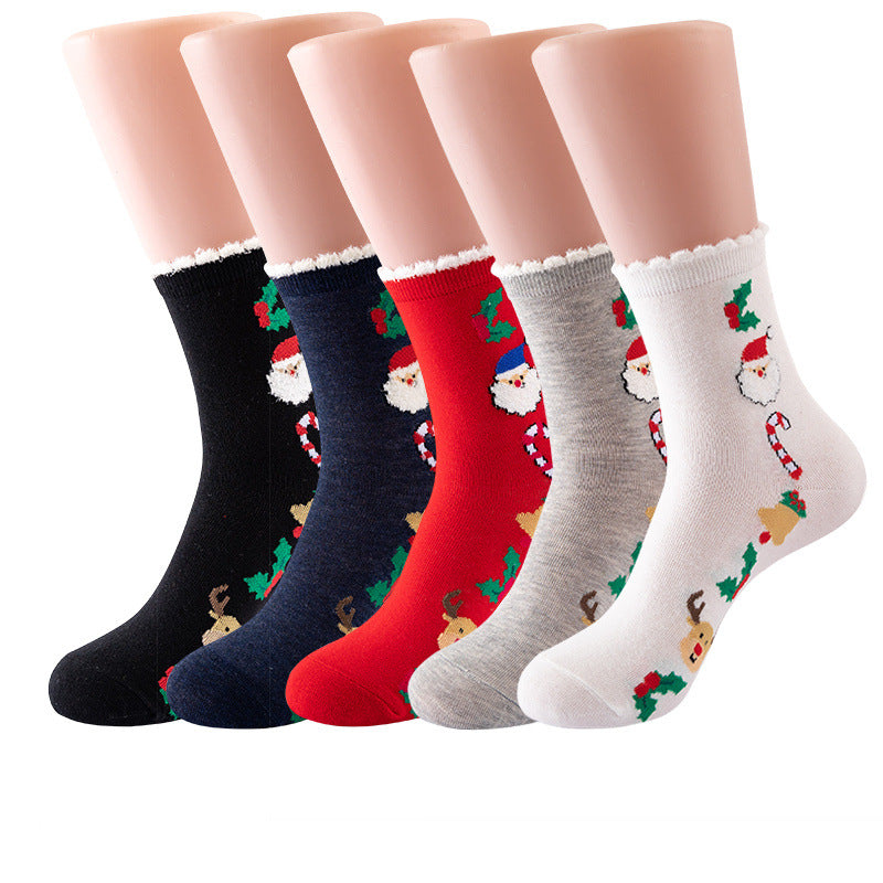 Women Christmas Socks Cartoon Santa Claus Cotton Socks 5 Pairs