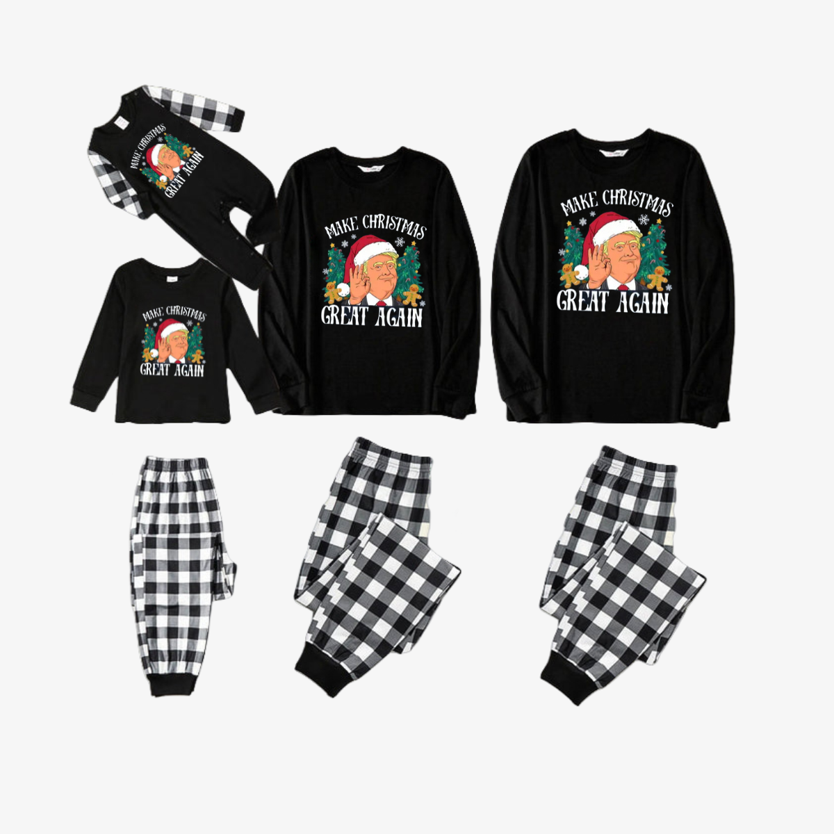 Making Memories Together Family Christmas 2025 Pajamas Set - Black Top Black and White Plaid Pants Santa Hat Graphic