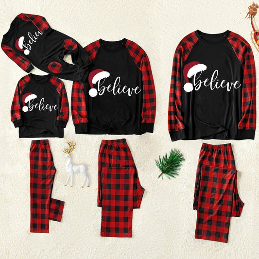 "FAMILY CHRISTMAS 2025" Text Printed and Santa Hat Pattern- Black Top with Red&Black&White Plaid Sleeves - Family Matching Pajamas