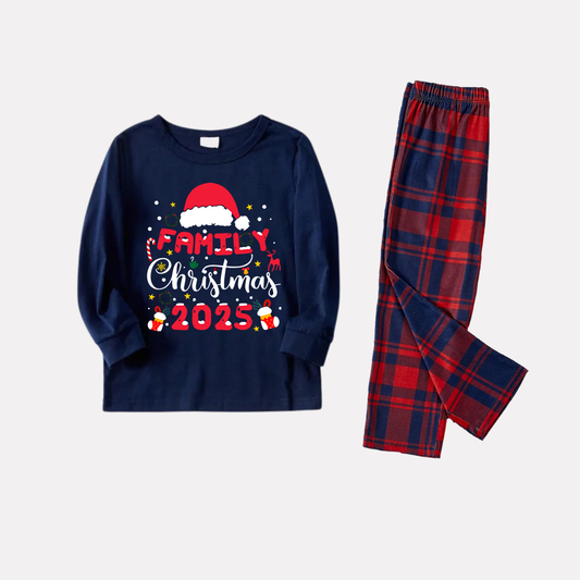 "Family Christmas 2025" Text and Santa Hat Prints Blue Long Sleeves Top with Red and Blue Plaid Pants Christmas Matching Pajamas