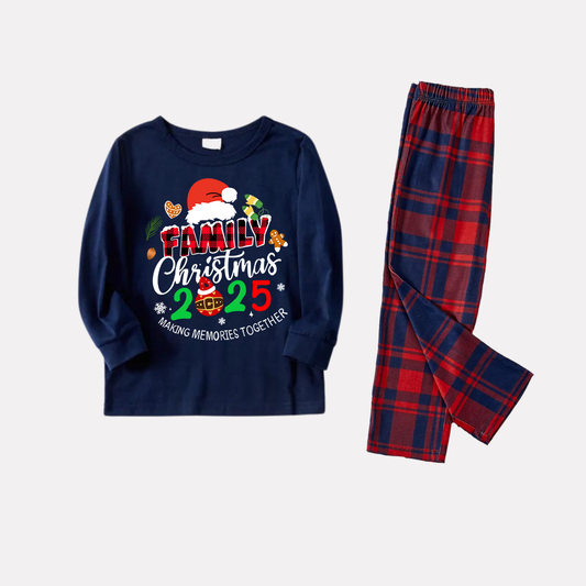 Cute "Family Christmas 2025" Pattern Printed Red and Blue Plaid Christmas Matching Pajamas