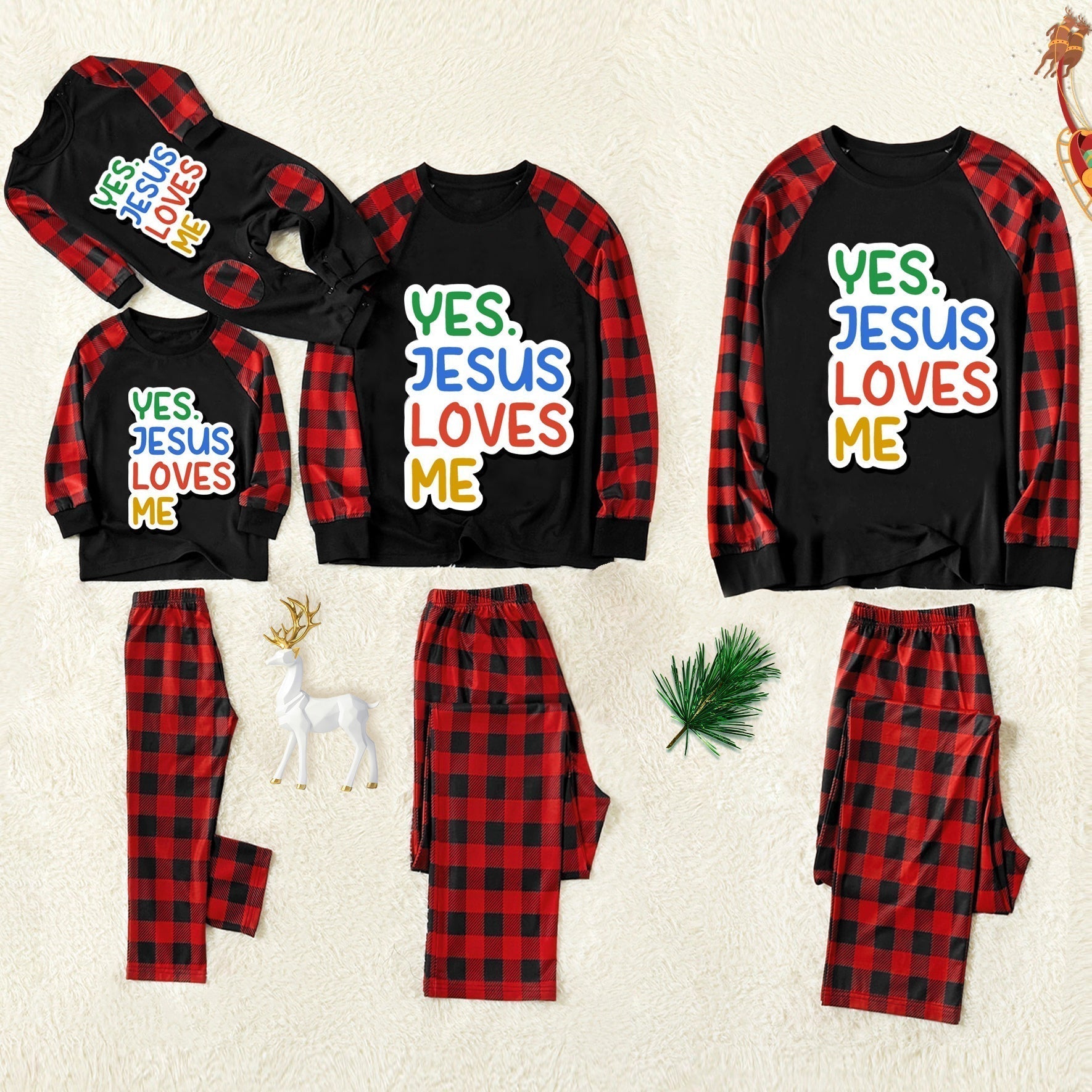Christmas "Jesus is the Reason of the Season" Letter Print Patterned Contrast Black top and Black & Red Plaid Pants Family Matching Pajamas Set With Dog Bandana
