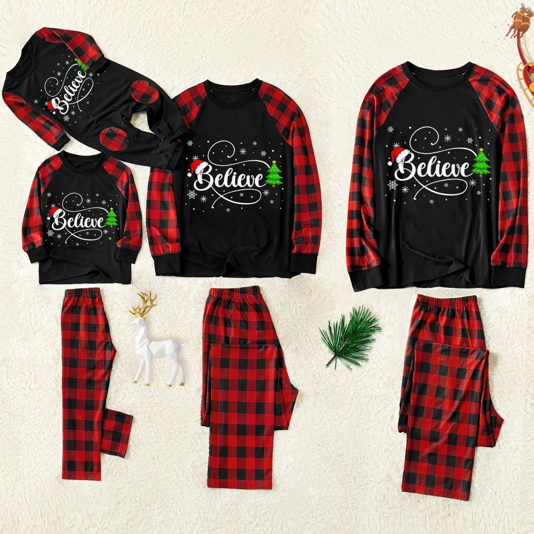 Christmas Hat and Snow Patterned Believe Letter Print Patterned Contrast Black top and Black & Red Plaid Pants Family Matching Pajamas Set
